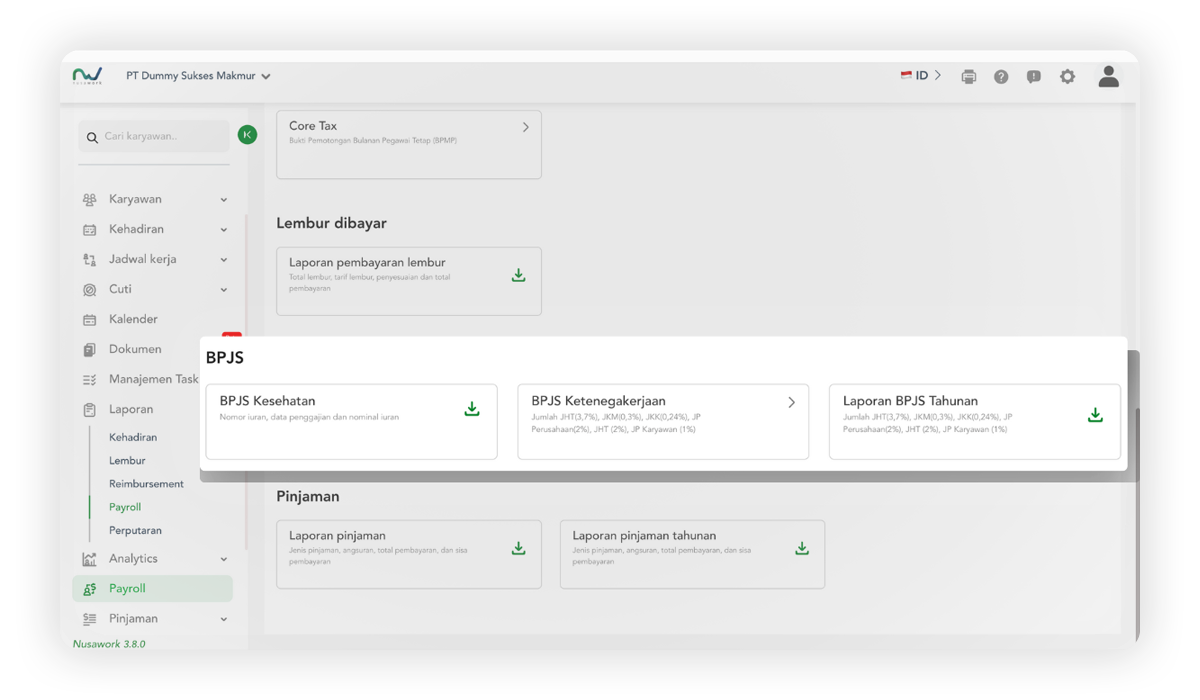 Unduh laporan BPJS Kesehatan dan Ketenagakerjaan siap pakai hanya dengan satu klik.